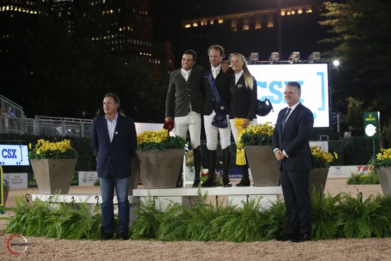 | Hardin Towell in his presentation ceremony with Daniel Bluman and Kristen Vanderveen, alongside Mark Bellissimo, CEO of International Equestrian Group (IEG), and Mark Wallace, Executive Vice President of Corporate Affairs and Chief of Staff at CSX. |