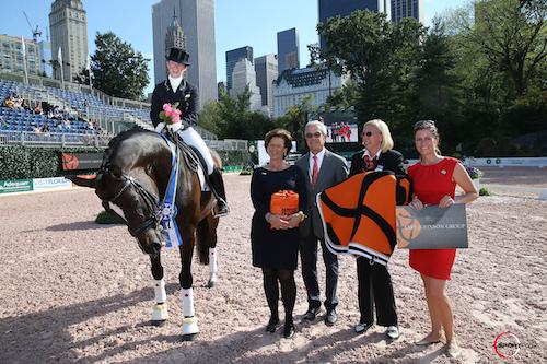 The Rolex Central Park Horse Show hosted its first-ever international dressage grand prix CDI4* in Wollman Rink on Friday afternoon with a win for Olympians Judy Reynolds and Vancouver K of Ireland with a high score of 73.80%. Reynolds guided the 14-year-old Dutch Warmblood gelding (by Jazz out of Phantastia) through a beautiful test for the first time in Central Park and had a great experience.
