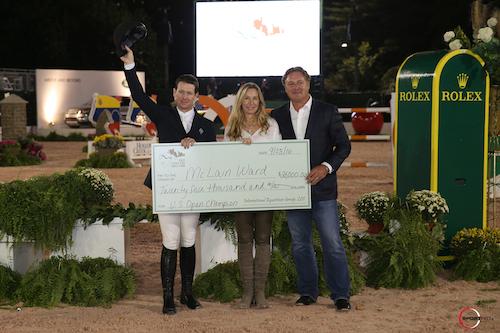 | McLain Ward was presented with a bonus check for $25,000 for winning the U.S. Open title, presented by Mark and Katherine Bellissimo. |