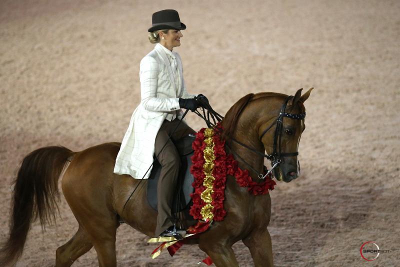 Melissa Fry’s mount Harry Trotter, exhibited by both John Ryan and Fry, was awarded the gold medal in the Arabian Country English Pleasure Pro/Am competition, which saw the largest number of class of entries. “This is my second year being back after 17 years away from Arabian horse competition,” said Fry, who hails from Annapolis, MD, of her winning ride. “To be doing this after only the second year back, it’s just such a perfect experience. The Arabian has always been a part of my life, so I’m just so proud to be here representing the Arabian breed.”